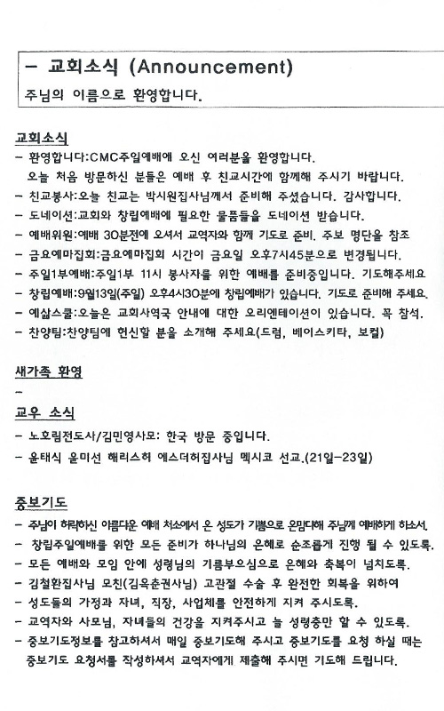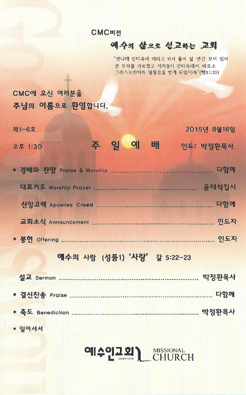 8/16 주보 By Hanry Posted 08/16/2015 In 주보 0 0 Hanry Recent PostsChurch of Jesus 16 마태복음(Matthew) 11:11 “예수님이 크게 보시는 사람” Whom Jesus Sees as Great.04/19 주보Church of Jesus 15 누가복음(Luke) 9:57-62 “제자됨의 조건” The Requirements for Discipleship.04/12 주보 Leave a Comment 응답 취소 다음 번 댓글 작성을 위해 이 브라우저에 이름, 이메일, 그리고 웹사이트를 저장합니다.