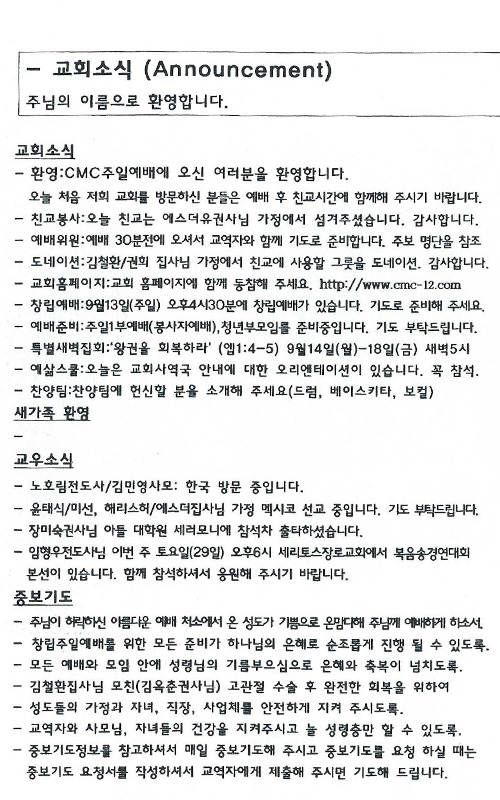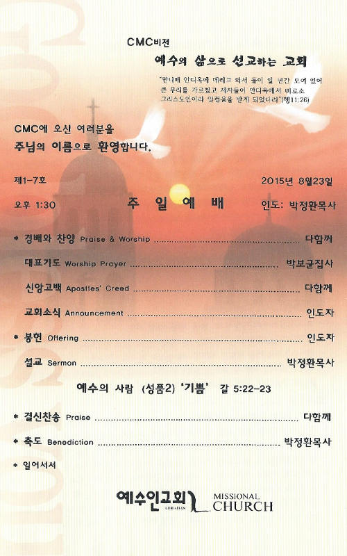 8/23 주보 By Hanry Posted 08/23/2015 In 주보 0 0 Hanry Recent PostsChurch of Jesus 16 마태복음(Matthew) 11:11 “예수님이 크게 보시는 사람” Whom Jesus Sees as Great.04/19 주보Church of Jesus 15 누가복음(Luke) 9:57-62 “제자됨의 조건” The Requirements for Discipleship.04/12 주보 Leave a Comment 응답 취소 다음 번 댓글 작성을 위해 이 브라우저에 이름, 이메일, 그리고 웹사이트를 저장합니다.