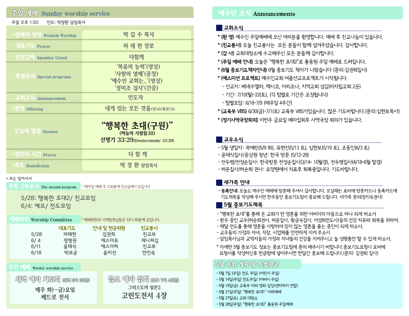 5/28 주보 By 예수인교회 Posted 06/02/2017 In 주보 0 0 예수인교회 Recent PostsChurch of Jesus 16 마태복음(Matthew) 11:11 “예수님이 크게 보시는 사람” Whom Jesus Sees as Great.04/19 주보Church of Jesus 15 누가복음(Luke) 9:57-62 “제자됨의 조건” The Requirements for Discipleship.04/12 주보 Leave a Comment 응답 취소 다음 번 댓글 작성을 위해 이 브라우저에 이름, 이메일, 그리고 웹사이트를 저장합니다.