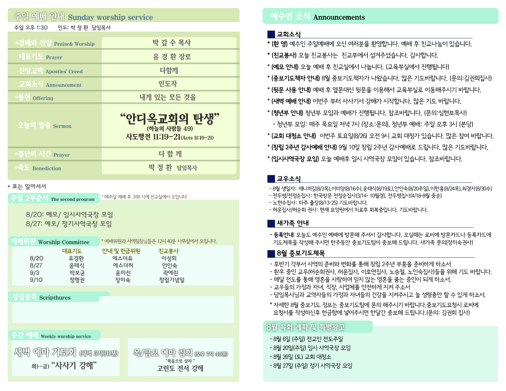 8/20 주보 By 예수인교회 Posted 08/20/2017 In 주보 0 0 예수인교회 Recent PostsChurch of Jesus 16 마태복음(Matthew) 11:11 “예수님이 크게 보시는 사람” Whom Jesus Sees as Great.04/19 주보Church of Jesus 15 누가복음(Luke) 9:57-62 “제자됨의 조건” The Requirements for Discipleship.04/12 주보 Leave a Comment 응답 취소 다음 번 댓글 작성을 위해 이 브라우저에 이름, 이메일, 그리고 웹사이트를 저장합니다.