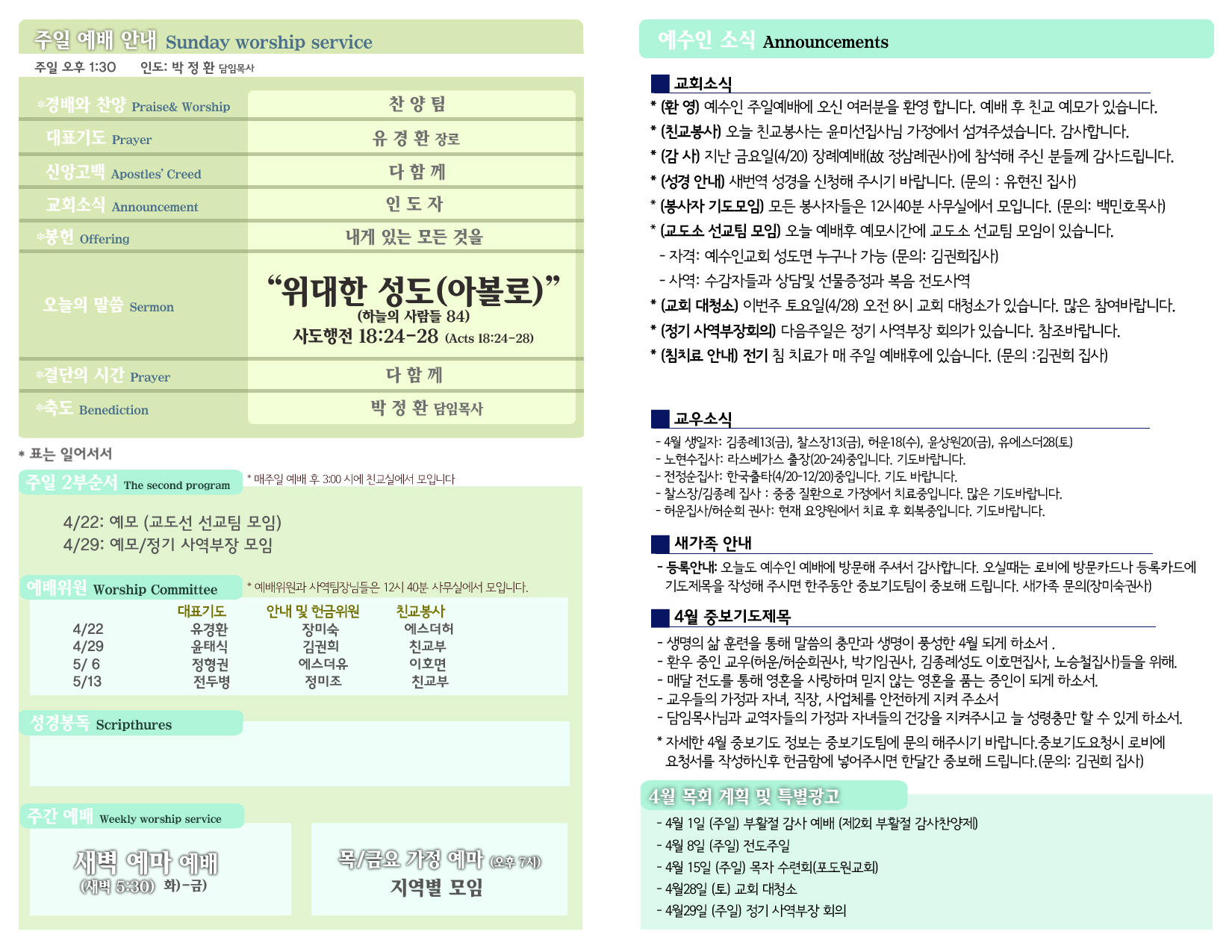 4/22 주보 By 예수인교회 Posted 04/22/2018 In 주보 0 0 예수인교회 Recent PostsChurch of Jesus 16 마태복음(Matthew) 11:11 “예수님이 크게 보시는 사람” Whom Jesus Sees as Great.04/19 주보Church of Jesus 15 누가복음(Luke) 9:57-62 “제자됨의 조건” The Requirements for Discipleship.04/12 주보 Leave a Comment 응답 취소 다음 번 댓글 작성을 위해 이 브라우저에 이름, 이메일, 그리고 웹사이트를 저장합니다.