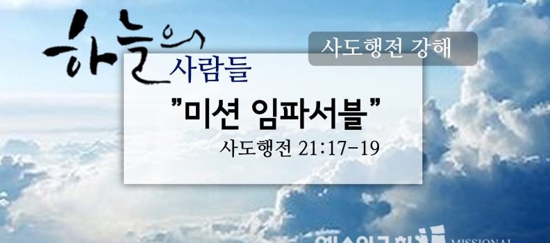 0 0 By 예수인교회 In 주일설교Posted 07/29/2018<7/29 하늘의사람들97(행21:17-19)“미션임파서블”><7/29 하늘의사람들97(행21:17-19)“미션임파서블”> 우리가예루살렘에 이르니, 형제들이 우리를 반가이 맞아 주었다. 17. After we arrived in Jerusalem, the brethren received us gladly. 이튿날바울은 우리와 함께야고보를 찾아갔는데, 장로들이 다 거기에 있었다. 18. And [...] READ MORE