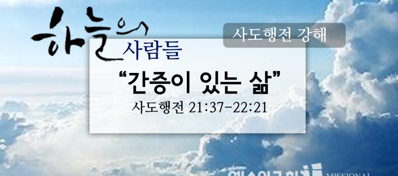 <8/12 하늘의사람들99(행21:37-22:21)“간증이 있는 삶”> 37. 바울이 병영 안으로 끌려 들어갈 즈음에, 그는 천부장에게 “한 말씀 드려도 됩니까?” 하고 물었다. 천부장이 “당신은 그리스 말을 할 줄 아오? 38.그러면 당신은 얼마 전에 폭동을 일으키고 사천 명의 자객을 이끌고 광야로 나간 [...]
