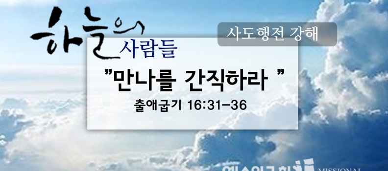 <8/26 하늘의사람들101(출16:31-36)“만나를 간직하라”> 이스라엘족속이 그 이름을 만나라 하였으며 깟씨 같고도 희고 맛은 꿀 섞은 과자 같았더라 모세가 가로되 여호와께서 이같이 명하시기를 이것을 오멜에 채워서 너희 대대 후손을 위하여 간수하라 이는 내가 너희를애굽 땅에서 인도하여 낼 때에 광야에서 너희에게 먹인 양식을 그들에게 [...]