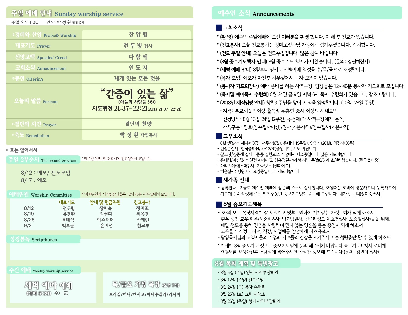 8/12 주보 By 예수인교회 Posted 08/13/2018 In 주보 0 0 예수인교회 Recent Posts0426 주보Church of Jesus 16 마태복음(Matthew) 11:11 “예수님이 크게 보시는 사람” Whom Jesus Sees as Great.04/19 주보Church of Jesus 15 누가복음(Luke) 9:57-62 “제자됨의 조건” The Requirements for Discipleship. Leave a Comment 응답 취소 다음 번 댓글 작성을 위해 이 브라우저에 이름, 이메일, 그리고 웹사이트를 저장합니다.