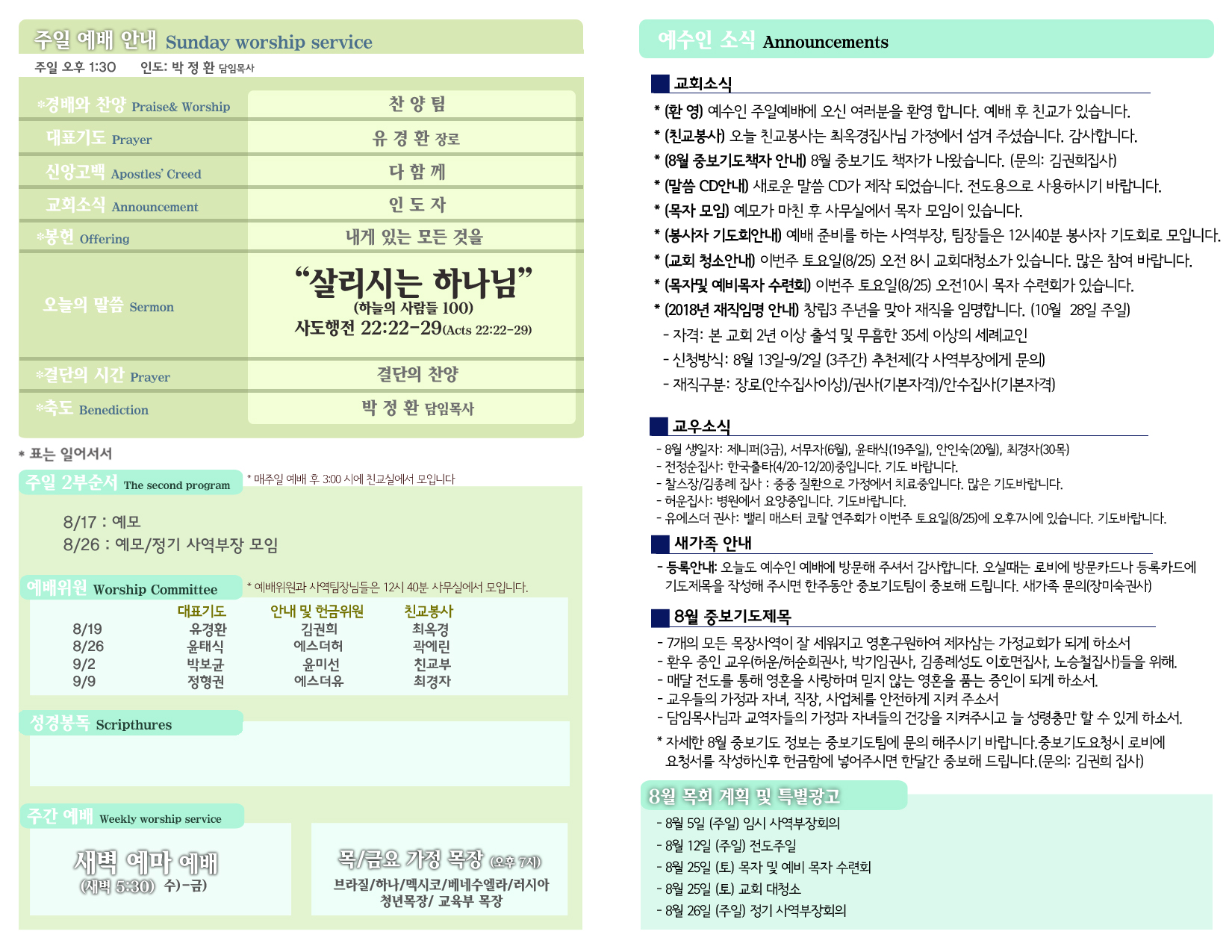 8/19 주보 By 예수인교회 Posted 08/19/2018 In 주보 0 0 예수인교회 Recent Posts0426 주보Church of Jesus 16 마태복음(Matthew) 11:11 “예수님이 크게 보시는 사람” Whom Jesus Sees as Great.04/19 주보Church of Jesus 15 누가복음(Luke) 9:57-62 “제자됨의 조건” The Requirements for Discipleship. Leave a Comment 응답 취소 다음 번 댓글 작성을 위해 이 브라우저에 이름, 이메일, 그리고 웹사이트를 저장합니다.