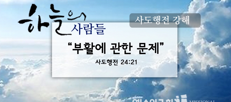 <10/14 하늘의사람들108(행 24:21)“부활에 관한 문제”> 행 24:21 다만 나는 그들 가운데 서서 말하기를 ‘오늘 내가 여러분에게 재판을 받고 있는 것은, 죽은 사람들의 부활과 관련된 문제 때문입니다’ 하는 이 한 마디 말을 부르짖었을 뿐입니다.” * 예수인교회 동영상 저작물입니다.