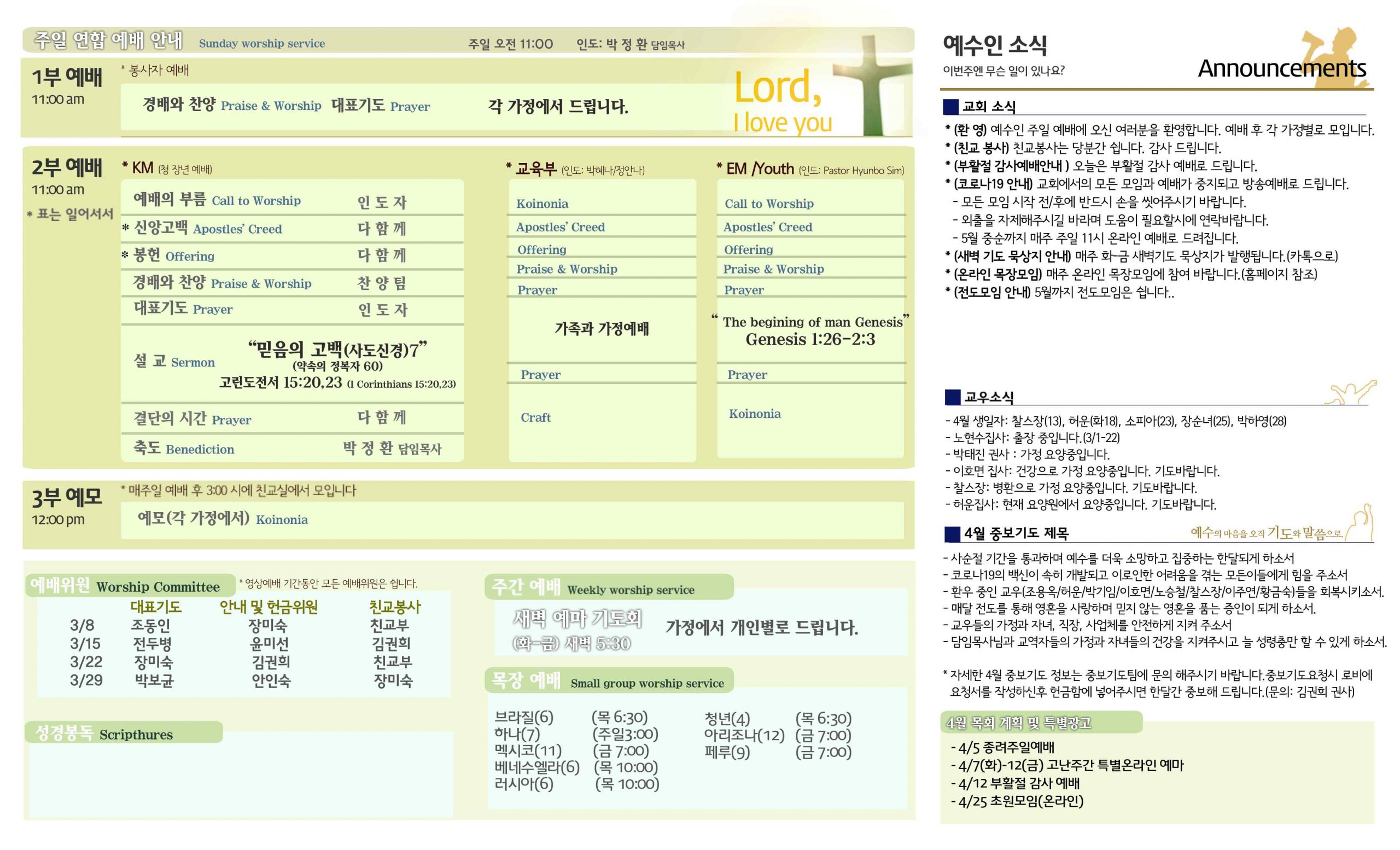 4/12 주보 By 예수인교회 Posted 04/12/2020 In 주보 0 0 예수인교회 Recent PostsChurch of Jesus 16 마태복음(Matthew) 11:11 “예수님이 크게 보시는 사람” Whom Jesus Sees as Great.04/19 주보Church of Jesus 15 누가복음(Luke) 9:57-62 “제자됨의 조건” The Requirements for Discipleship.04/12 주보 Leave a Comment 응답 취소 다음 번 댓글 작성을 위해 이 브라우저에 이름, 이메일, 그리고 웹사이트를 저장합니다.