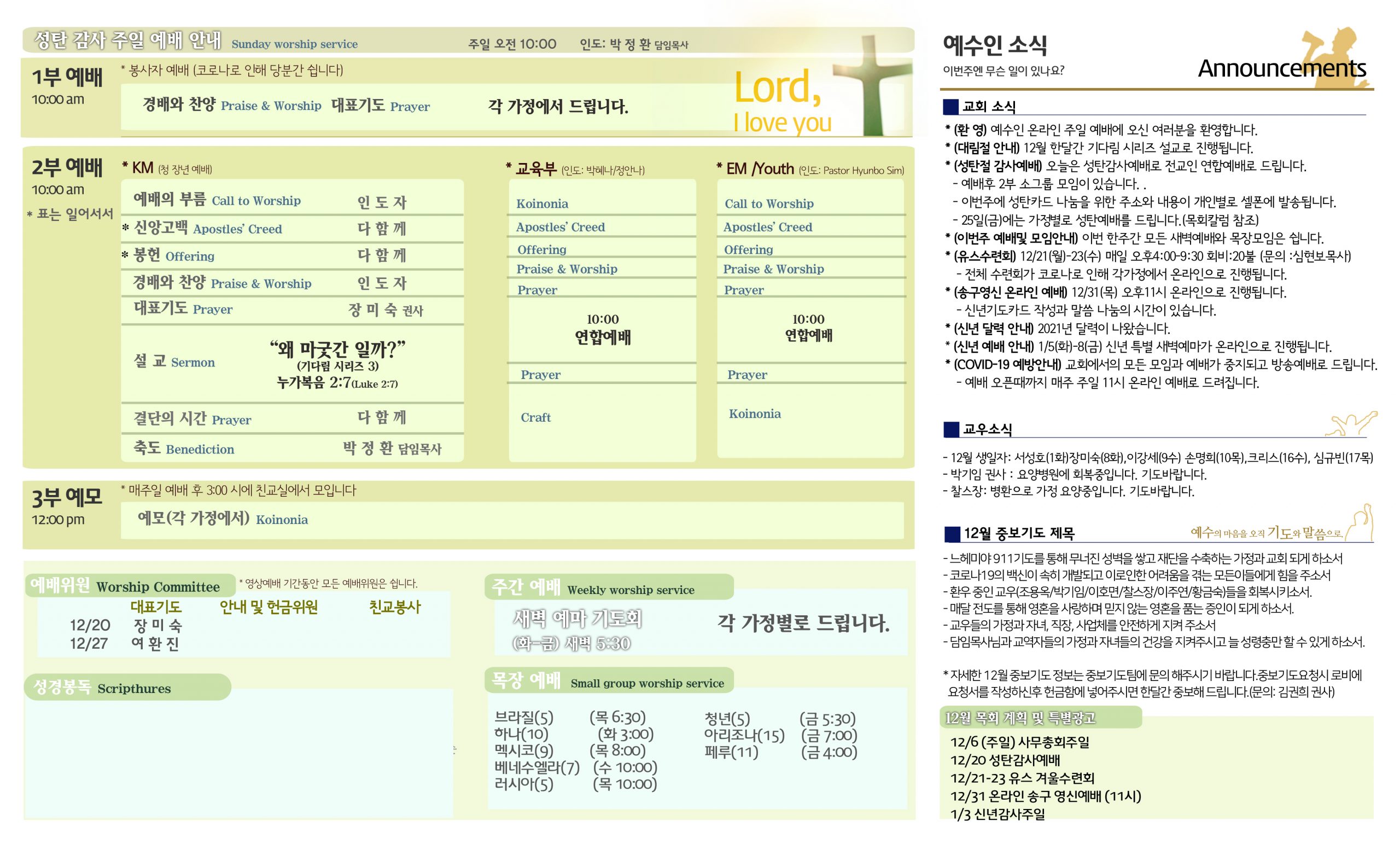 12/20 주보 By 예수인교회 Posted 12/20/2020 In 주보 0 0 예수인교회 Recent PostsChurch of Jesus 16 마태복음(Matthew) 11:11 “예수님이 크게 보시는 사람” Whom Jesus Sees as Great.04/19 주보Church of Jesus 15 누가복음(Luke) 9:57-62 “제자됨의 조건” The Requirements for Discipleship.04/12 주보 Leave a Comment 응답 취소 다음 번 댓글 작성을 위해 이 브라우저에 이름, 이메일, 그리고 웹사이트를 저장합니다.