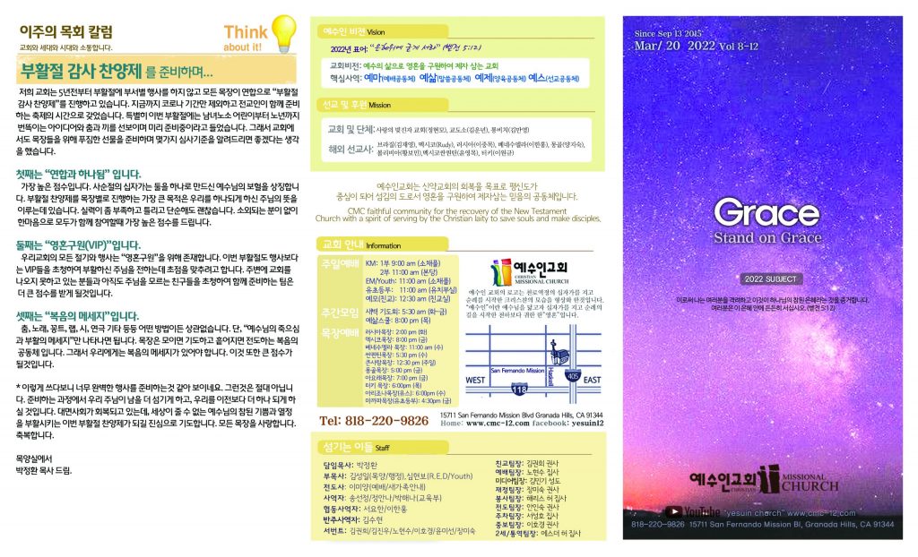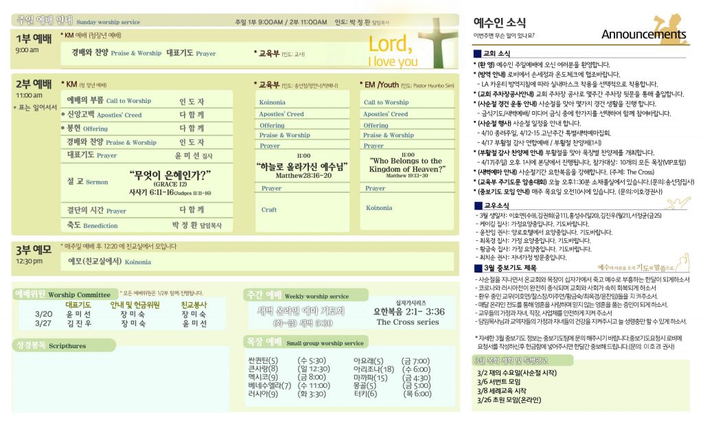 3/20 주보 By 예수인교회 Posted 03/20/2022 In 주보 0 0 예수인교회 Recent PostsChurch of Jesus 16 마태복음(Matthew) 11:11 “예수님이 크게 보시는 사람” Whom Jesus Sees as Great.04/19 주보Church of Jesus 15 누가복음(Luke) 9:57-62 “제자됨의 조건” The Requirements for Discipleship.04/12 주보 Leave a Comment 응답 취소 다음 번 댓글 작성을 위해 이 브라우저에 이름, 이메일, 그리고 웹사이트를 저장합니다.