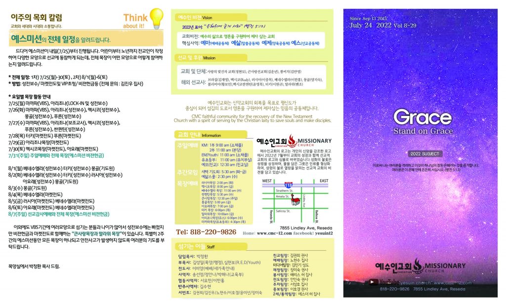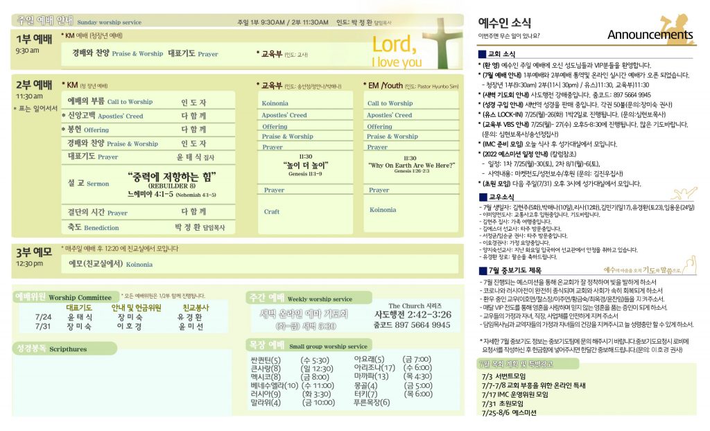 7/24 주보 By 예수인교회 Posted 07/24/2022 In 주보 0 0 예수인교회 Recent Posts0426 주보Church of Jesus 16 마태복음(Matthew) 11:11 “예수님이 크게 보시는 사람” Whom Jesus Sees as Great.04/19 주보Church of Jesus 15 누가복음(Luke) 9:57-62 “제자됨의 조건” The Requirements for Discipleship. Leave a Comment 응답 취소 다음 번 댓글 작성을 위해 이 브라우저에 이름, 이메일, 그리고 웹사이트를 저장합니다.