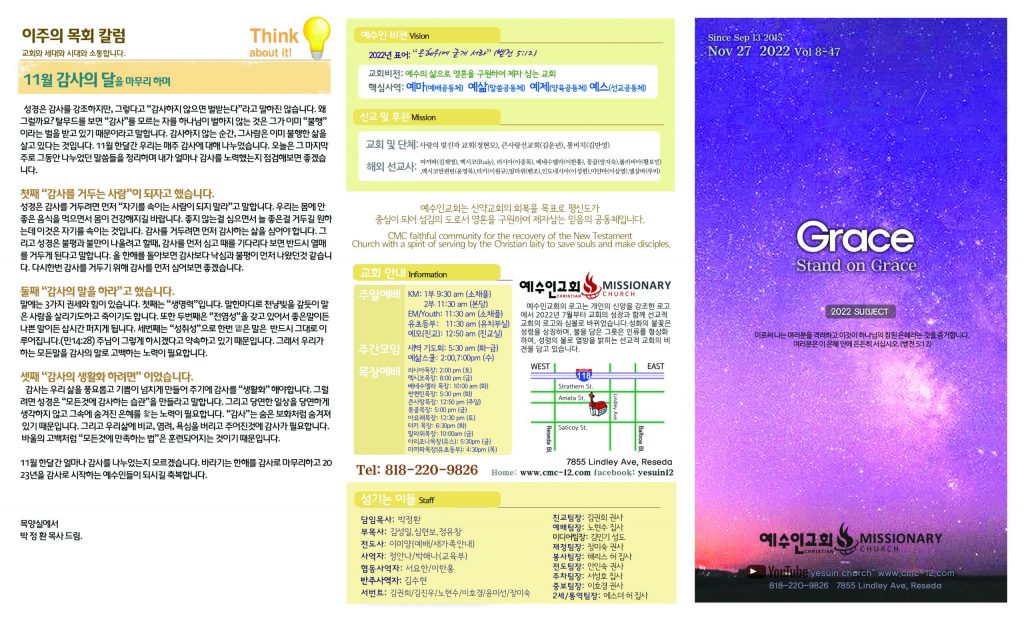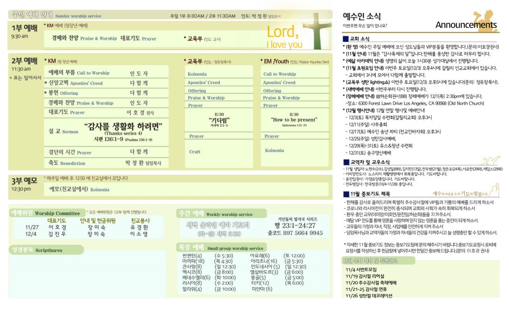 11/27 주보 By 예수인교회 Posted 11/27/2022 In 주보 0 0 예수인교회 Recent Posts0426 주보Church of Jesus 16 마태복음(Matthew) 11:11 “예수님이 크게 보시는 사람” Whom Jesus Sees as Great.04/19 주보Church of Jesus 15 누가복음(Luke) 9:57-62 “제자됨의 조건” The Requirements for Discipleship. Leave a Comment 응답 취소 다음 번 댓글 작성을 위해 이 브라우저에 이름, 이메일, 그리고 웹사이트를 저장합니다.