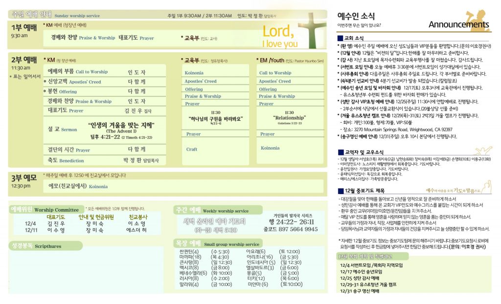 12/4 주보 By 예수인교회 Posted 12/04/2022 In 주보 0 0 예수인교회 Recent Posts0426 주보Church of Jesus 16 마태복음(Matthew) 11:11 “예수님이 크게 보시는 사람” Whom Jesus Sees as Great.04/19 주보Church of Jesus 15 누가복음(Luke) 9:57-62 “제자됨의 조건” The Requirements for Discipleship. Leave a Comment 응답 취소 다음 번 댓글 작성을 위해 이 브라우저에 이름, 이메일, 그리고 웹사이트를 저장합니다.