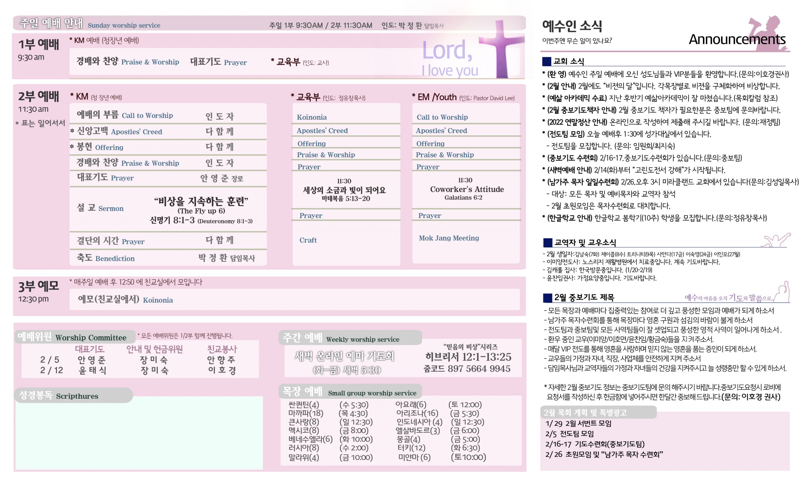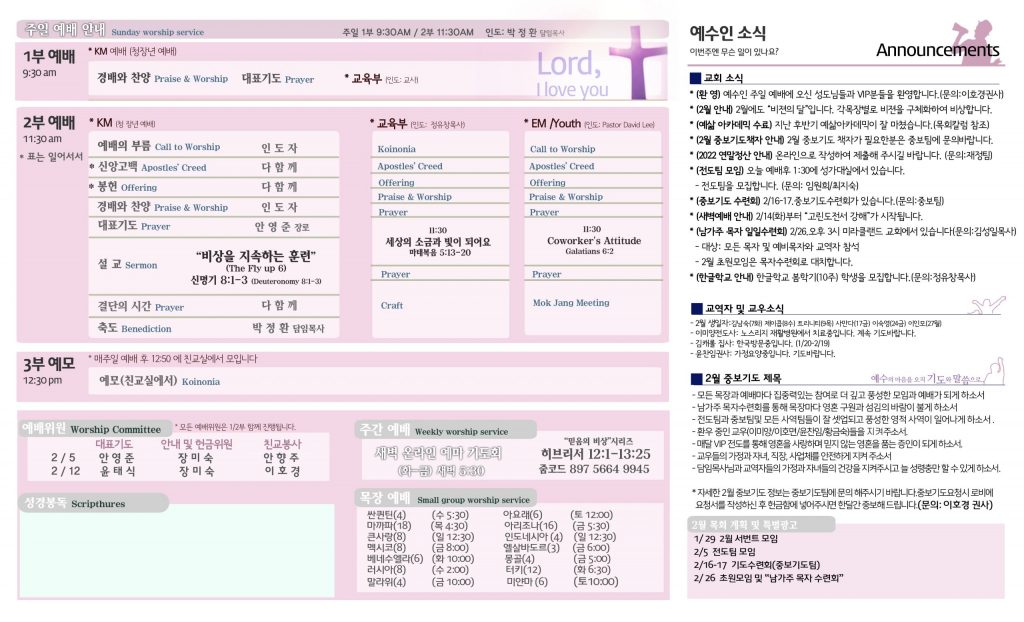 2/5 주보 By 예수인교회 Posted 02/05/2023 In 주보 0 0 예수인교회 Recent PostsChurch of Jesus 16 마태복음(Matthew) 11:11 “예수님이 크게 보시는 사람” Whom Jesus Sees as Great.04/19 주보Church of Jesus 15 누가복음(Luke) 9:57-62 “제자됨의 조건” The Requirements for Discipleship.04/12 주보 Leave a Comment 응답 취소 다음 번 댓글 작성을 위해 이 브라우저에 이름, 이메일, 그리고 웹사이트를 저장합니다.