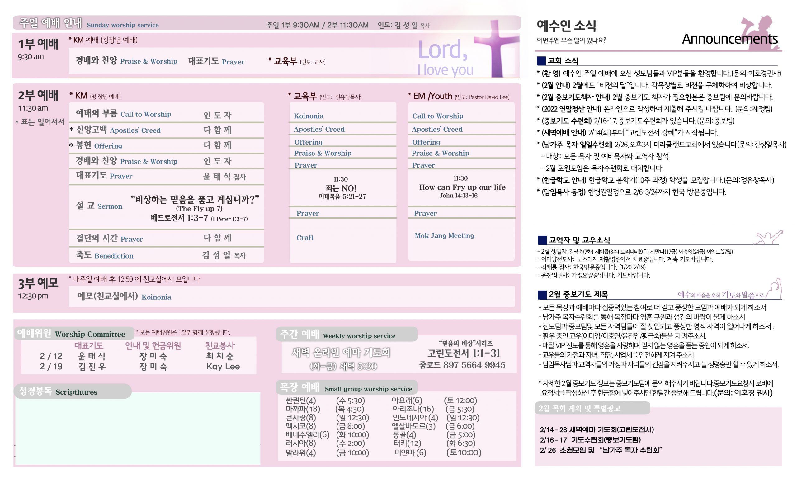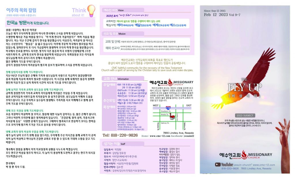 2/12 주보 By 예수인교회 Posted 02/12/2023 In 주보 0 0 예수인교회 Recent PostsChurch of Jesus 16 마태복음(Matthew) 11:11 “예수님이 크게 보시는 사람” Whom Jesus Sees as Great.04/19 주보Church of Jesus 15 누가복음(Luke) 9:57-62 “제자됨의 조건” The Requirements for Discipleship.04/12 주보 Leave a Comment 응답 취소 다음 번 댓글 작성을 위해 이 브라우저에 이름, 이메일, 그리고 웹사이트를 저장합니다.