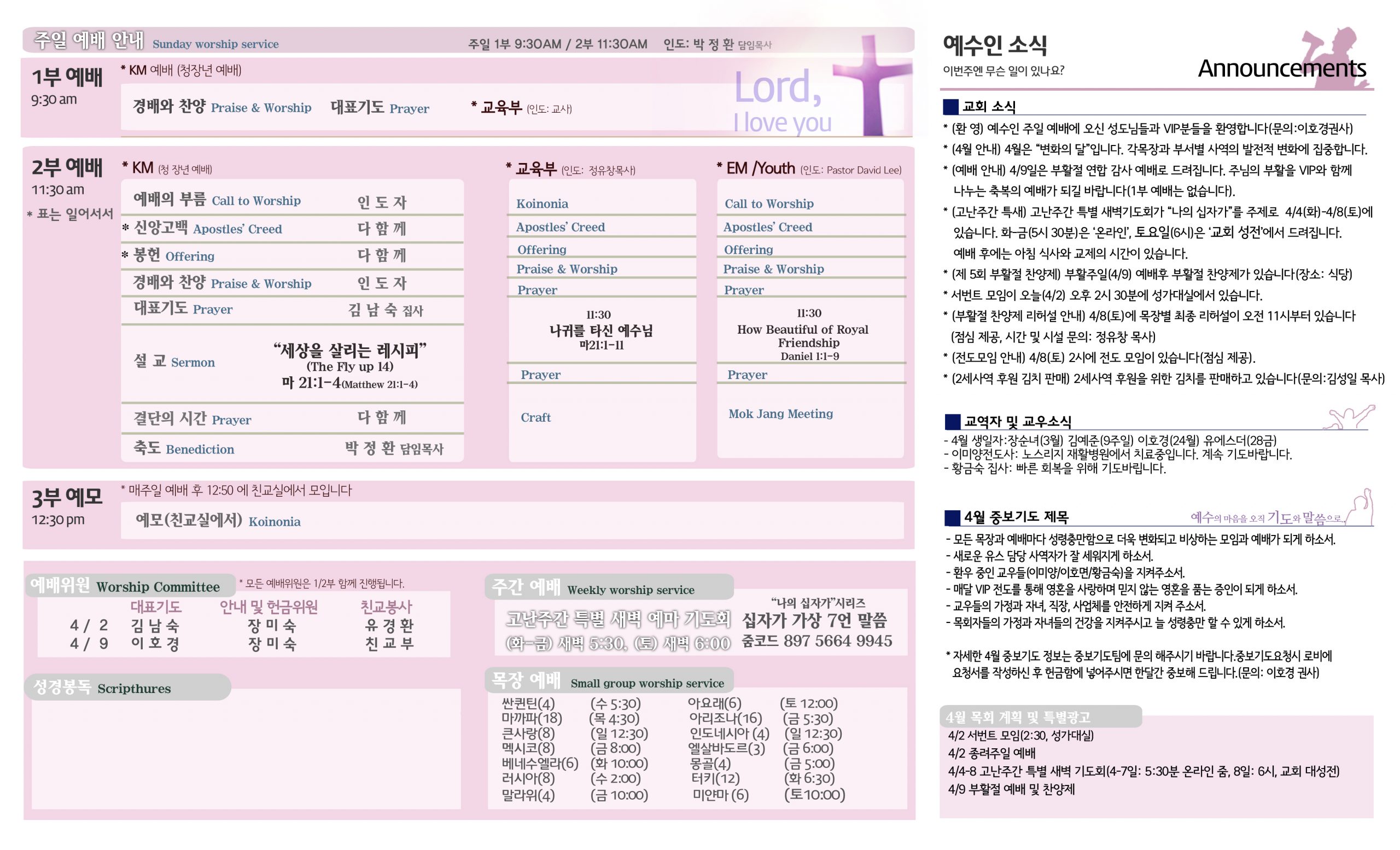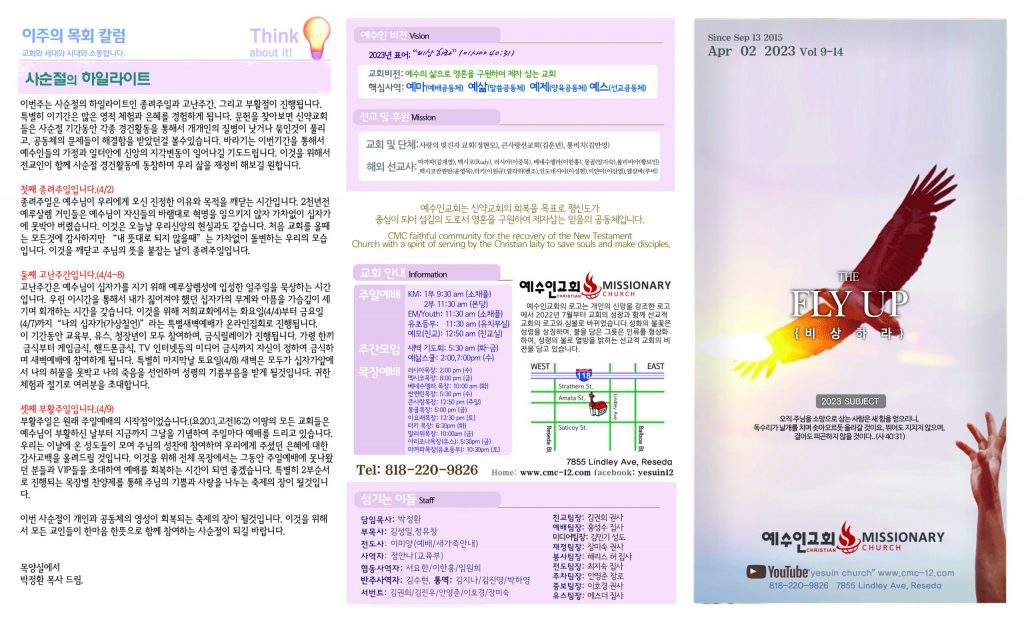 4/2 주보 By 예수인교회 Posted 04/02/2023 In 주보 0 0 예수인교회 Recent PostsChurch of Jesus 16 마태복음(Matthew) 11:11 “예수님이 크게 보시는 사람” Whom Jesus Sees as Great.04/19 주보Church of Jesus 15 누가복음(Luke) 9:57-62 “제자됨의 조건” The Requirements for Discipleship.04/12 주보 Leave a Comment 응답 취소 다음 번 댓글 작성을 위해 이 브라우저에 이름, 이메일, 그리고 웹사이트를 저장합니다.