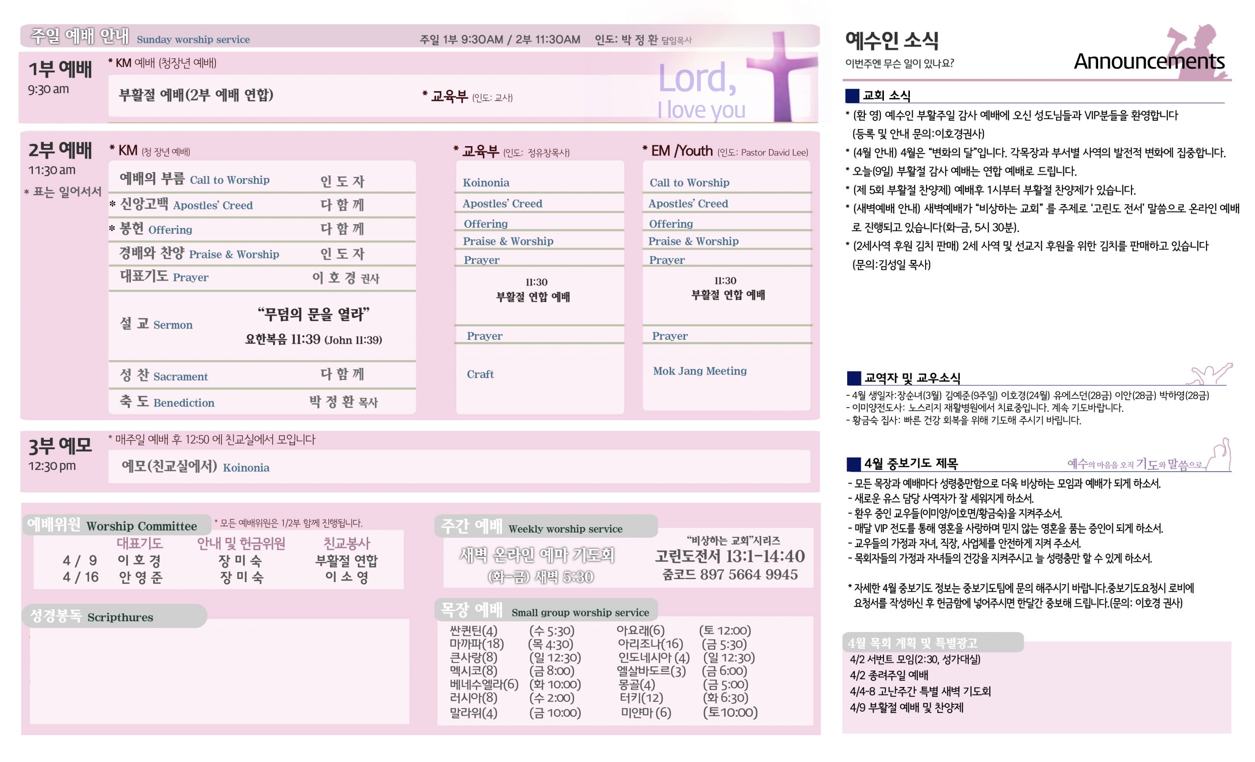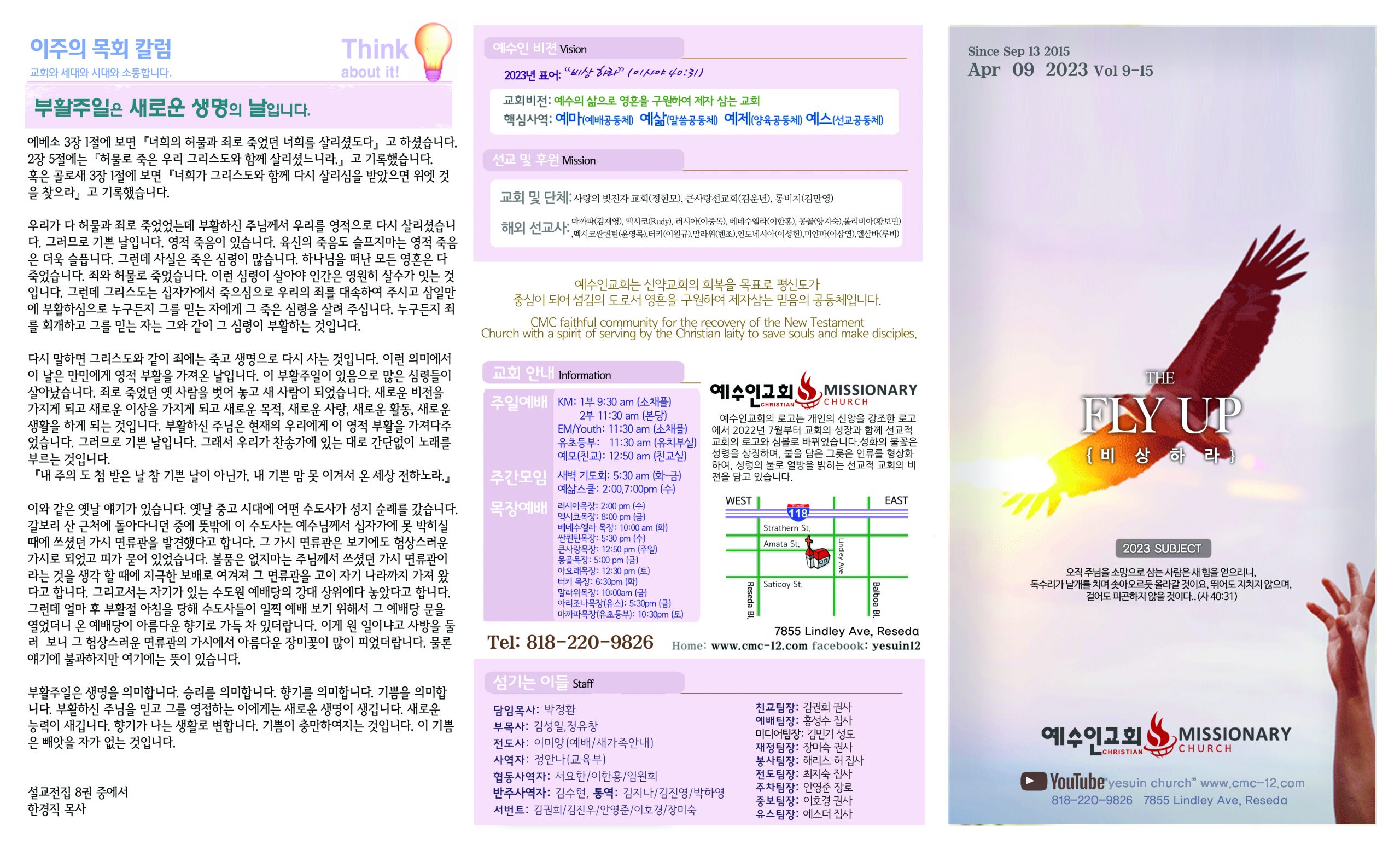 4/9 주보 By 예수인교회 Posted 04/09/2023 In 주보 0 0 예수인교회 Recent PostsChurch of Jesus 16 마태복음(Matthew) 11:11 “예수님이 크게 보시는 사람” Whom Jesus Sees as Great.04/19 주보Church of Jesus 15 누가복음(Luke) 9:57-62 “제자됨의 조건” The Requirements for Discipleship.04/12 주보 Leave a Comment 응답 취소 다음 번 댓글 작성을 위해 이 브라우저에 이름, 이메일, 그리고 웹사이트를 저장합니다.