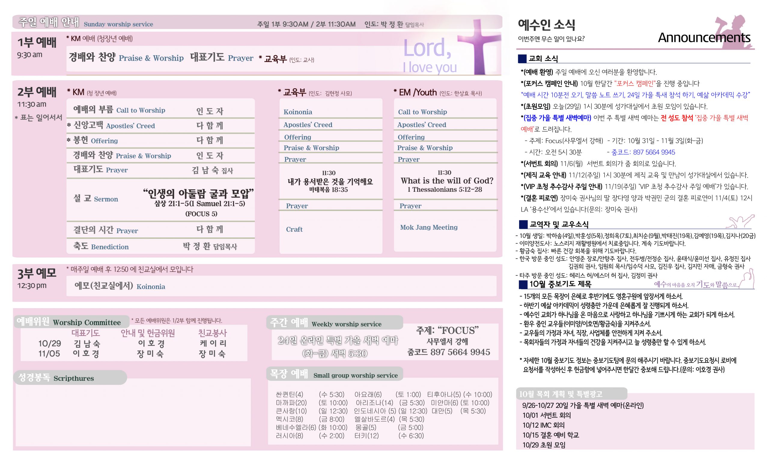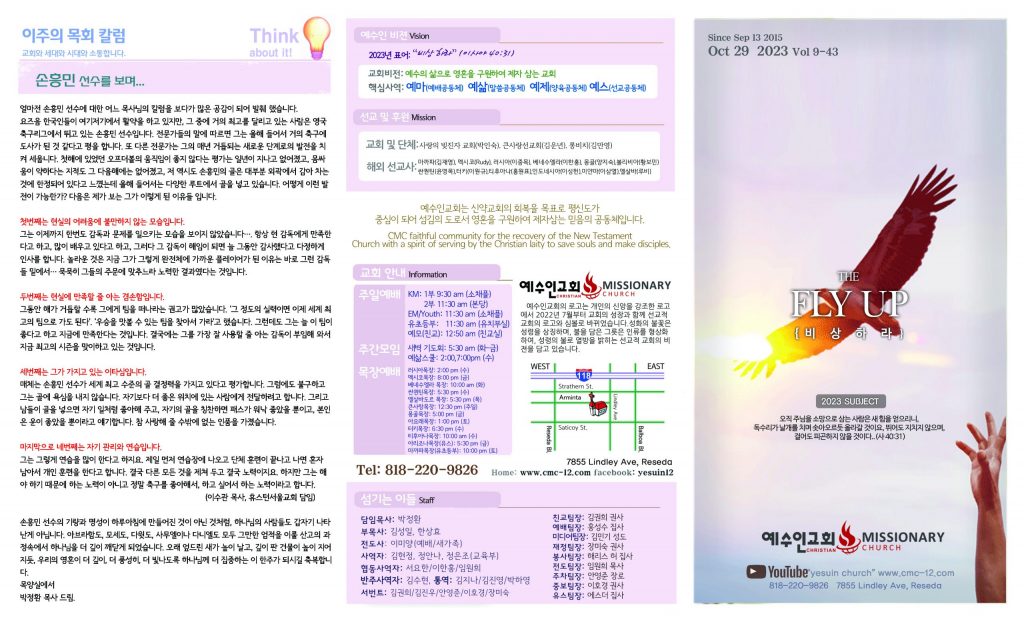 10/29 주보 By 예수인교회 Posted 10/29/2023 In 주보 0 0 예수인교회 Recent PostsChurch of Jesus 16 마태복음(Matthew) 11:11 “예수님이 크게 보시는 사람” Whom Jesus Sees as Great.04/19 주보Church of Jesus 15 누가복음(Luke) 9:57-62 “제자됨의 조건” The Requirements for Discipleship.04/12 주보 Leave a Comment 응답 취소 다음 번 댓글 작성을 위해 이 브라우저에 이름, 이메일, 그리고 웹사이트를 저장합니다.