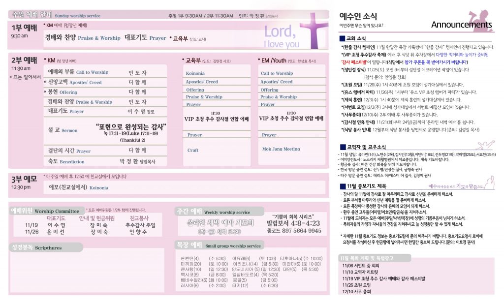 11/19 주보 By 예수인교회 Posted 11/19/2023 In 주보 0 0 예수인교회 Recent PostsChurch of Jesus 16 마태복음(Matthew) 11:11 “예수님이 크게 보시는 사람” Whom Jesus Sees as Great.04/19 주보Church of Jesus 15 누가복음(Luke) 9:57-62 “제자됨의 조건” The Requirements for Discipleship.04/12 주보 Leave a Comment 응답 취소 다음 번 댓글 작성을 위해 이 브라우저에 이름, 이메일, 그리고 웹사이트를 저장합니다.