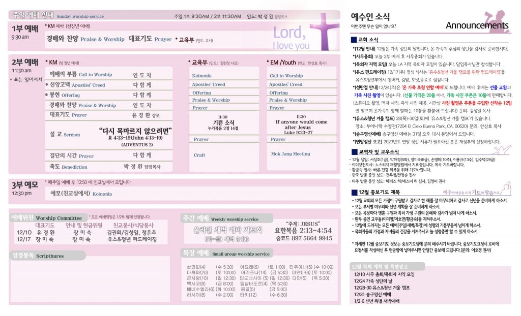 12/10 주보 By 예수인교회 Posted 12/10/2023 In 주보 0 0 예수인교회 Recent PostsChurch of Jesus 16 마태복음(Matthew) 11:11 “예수님이 크게 보시는 사람” Whom Jesus Sees as Great.04/19 주보Church of Jesus 15 누가복음(Luke) 9:57-62 “제자됨의 조건” The Requirements for Discipleship.04/12 주보 Leave a Comment 응답 취소 다음 번 댓글 작성을 위해 이 브라우저에 이름, 이메일, 그리고 웹사이트를 저장합니다.