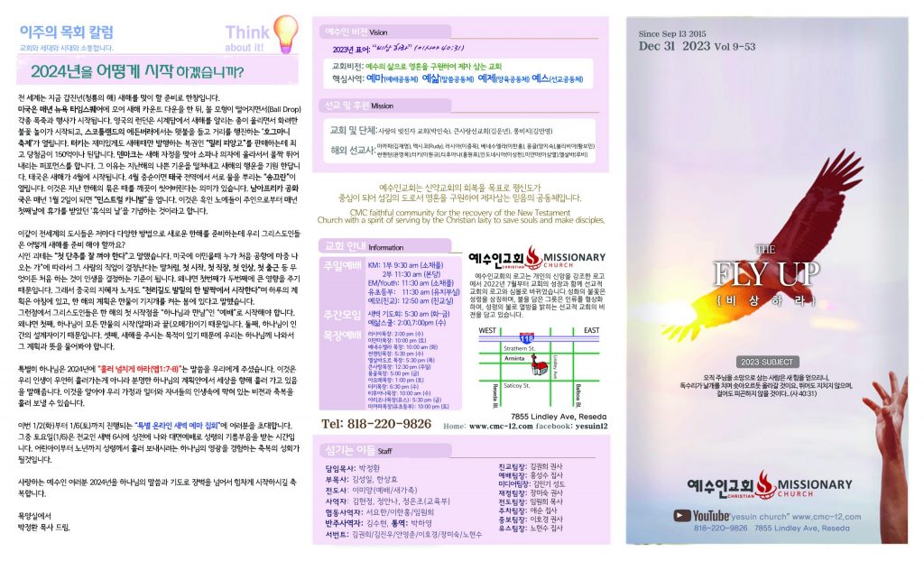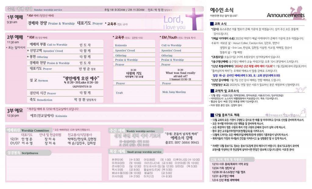 12/31 주보 By 예수인교회 Posted 12/31/2023 In 주보 0 0 예수인교회 Recent PostsChurch of Jesus 16 마태복음(Matthew) 11:11 “예수님이 크게 보시는 사람” Whom Jesus Sees as Great.04/19 주보Church of Jesus 15 누가복음(Luke) 9:57-62 “제자됨의 조건” The Requirements for Discipleship.04/12 주보 Leave a Comment 응답 취소 다음 번 댓글 작성을 위해 이 브라우저에 이름, 이메일, 그리고 웹사이트를 저장합니다.