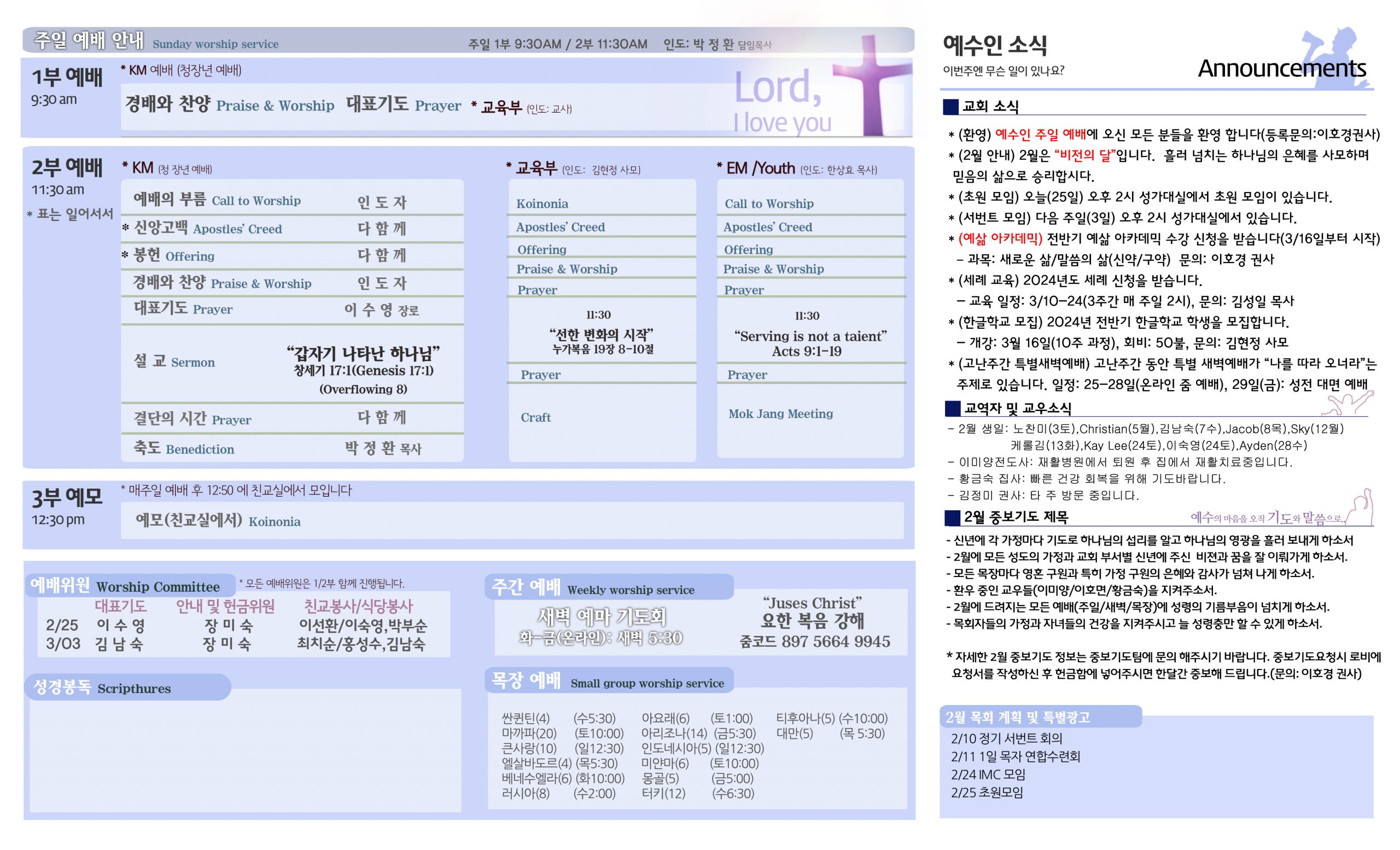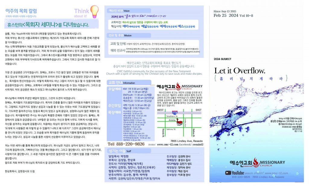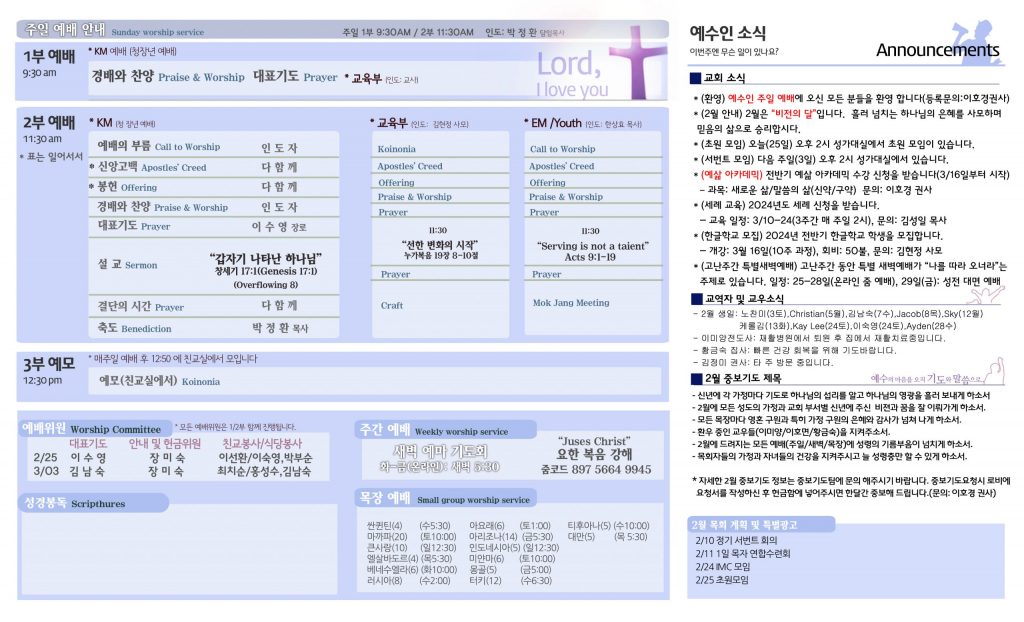 2/25 주보 By 예수인교회 Posted 02/25/2024 In 주보 0 0 예수인교회 Recent PostsChurch of Jesus 16 마태복음(Matthew) 11:11 “예수님이 크게 보시는 사람” Whom Jesus Sees as Great.04/19 주보Church of Jesus 15 누가복음(Luke) 9:57-62 “제자됨의 조건” The Requirements for Discipleship.04/12 주보 Leave a Comment 응답 취소 다음 번 댓글 작성을 위해 이 브라우저에 이름, 이메일, 그리고 웹사이트를 저장합니다.