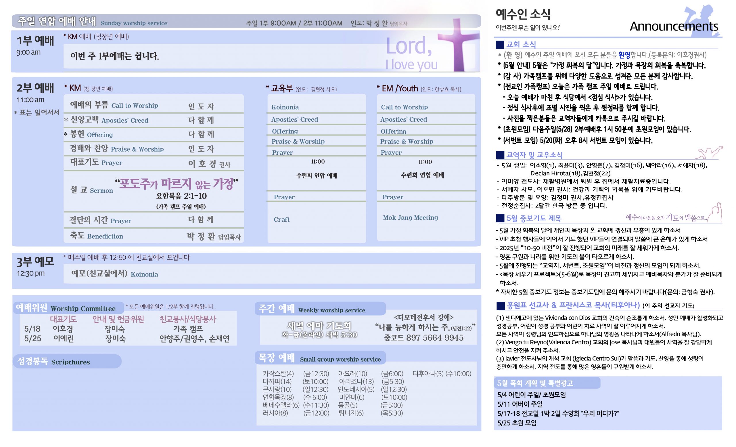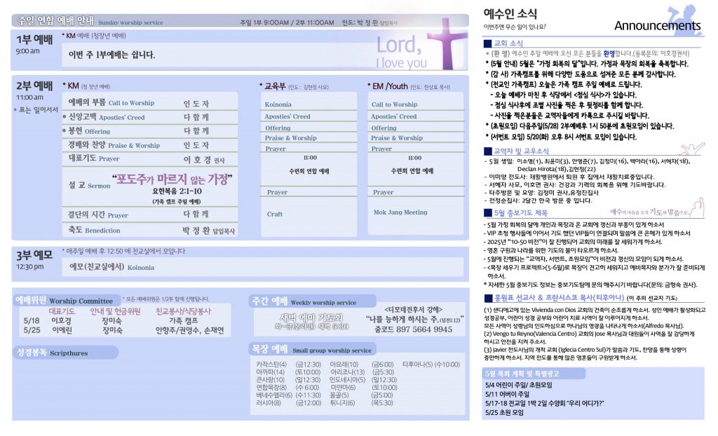 5/18 주보 By 예수인교회 Posted 05/18/2025 In 주보 0 0 예수인교회 Recent PostsChurch of Jesus 16 마태복음(Matthew) 11:11 “예수님이 크게 보시는 사람” Whom Jesus Sees as Great.04/19 주보Church of Jesus 15 누가복음(Luke) 9:57-62 “제자됨의 조건” The Requirements for Discipleship.04/12 주보 Leave a Comment 응답 취소 다음 번 댓글 작성을 위해 이 브라우저에 이름, 이메일, 그리고 웹사이트를 저장합니다.