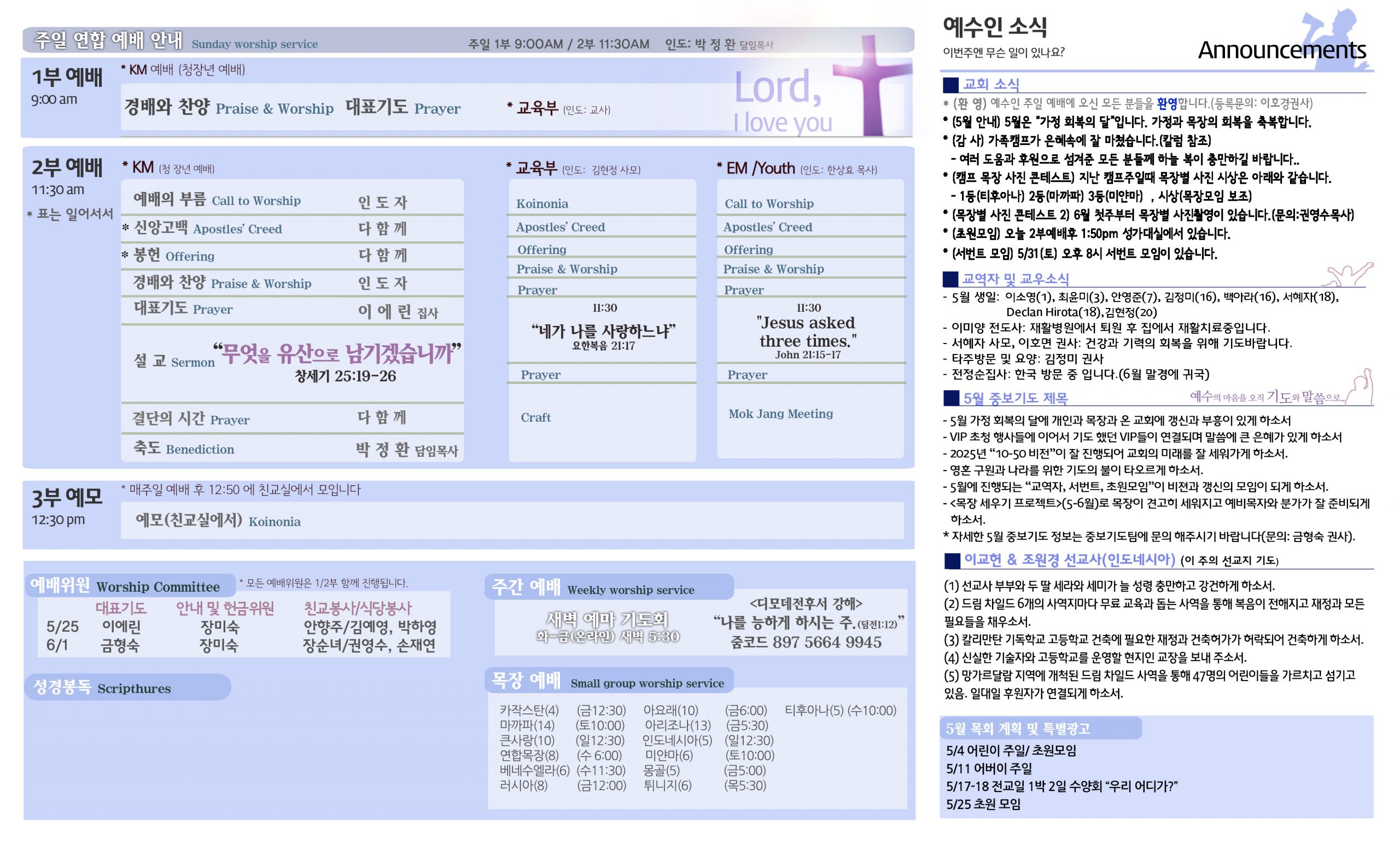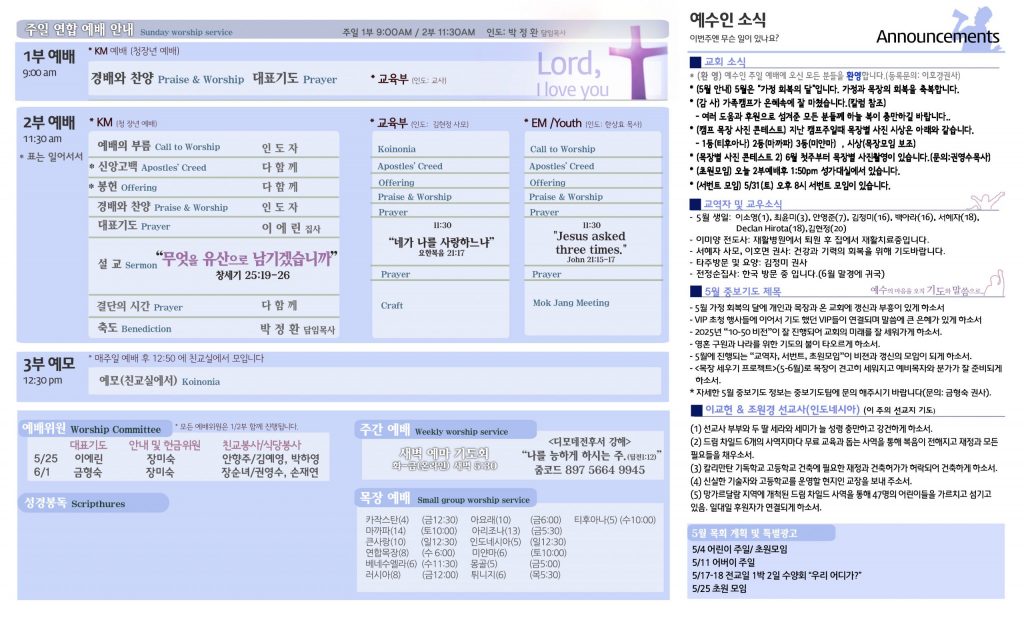 5/25 주보 By 예수인교회 Posted 05/25/2025 In 주보 0 0 예수인교회 Recent PostsChurch of Jesus 16 마태복음(Matthew) 11:11 “예수님이 크게 보시는 사람” Whom Jesus Sees as Great.04/19 주보Church of Jesus 15 누가복음(Luke) 9:57-62 “제자됨의 조건” The Requirements for Discipleship.04/12 주보 Leave a Comment 응답 취소 다음 번 댓글 작성을 위해 이 브라우저에 이름, 이메일, 그리고 웹사이트를 저장합니다.