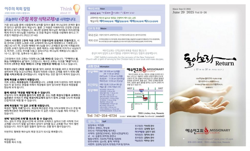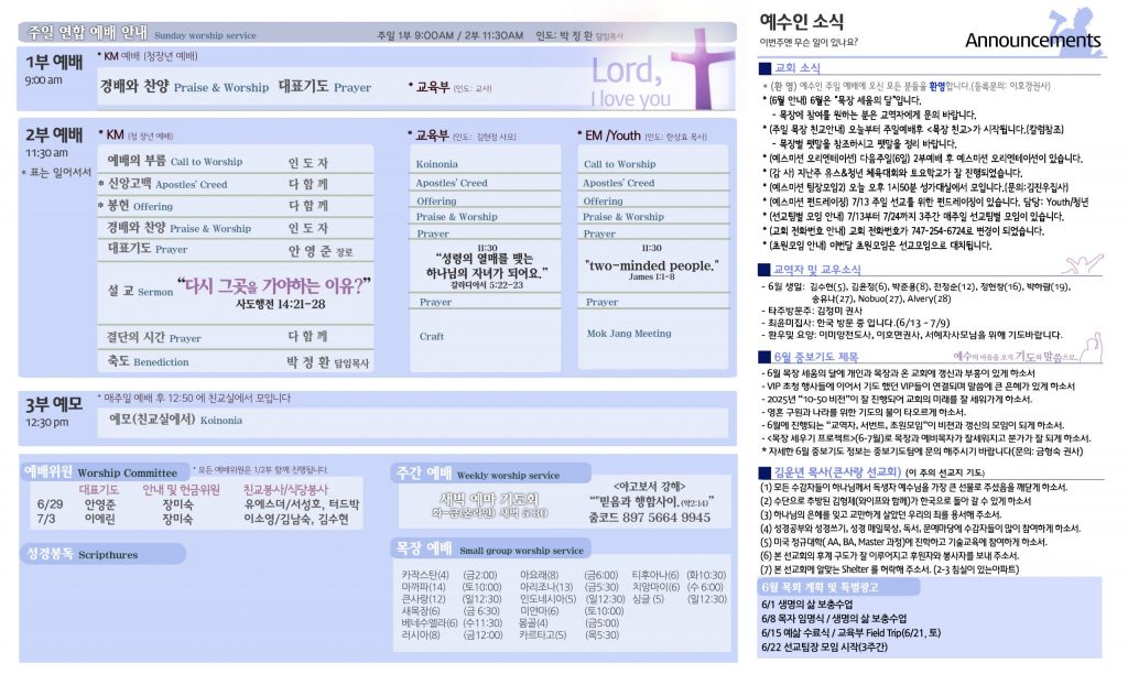 6/29 주보 By 예수인교회 Posted 06/29/2025 In 주보 0 0 예수인교회 Recent Posts10/12 주보Annointing 60 행 18:12-23 성장하게 만드는 탈진가을 특새 메세지 아가서 6: 1-10 일어나 함께가는 사랑10/5 주보 Leave a Comment 응답 취소 다음 번 댓글 작성을 위해 이 브라우저에 이름, 이메일, 그리고 웹사이트를 저장합니다.