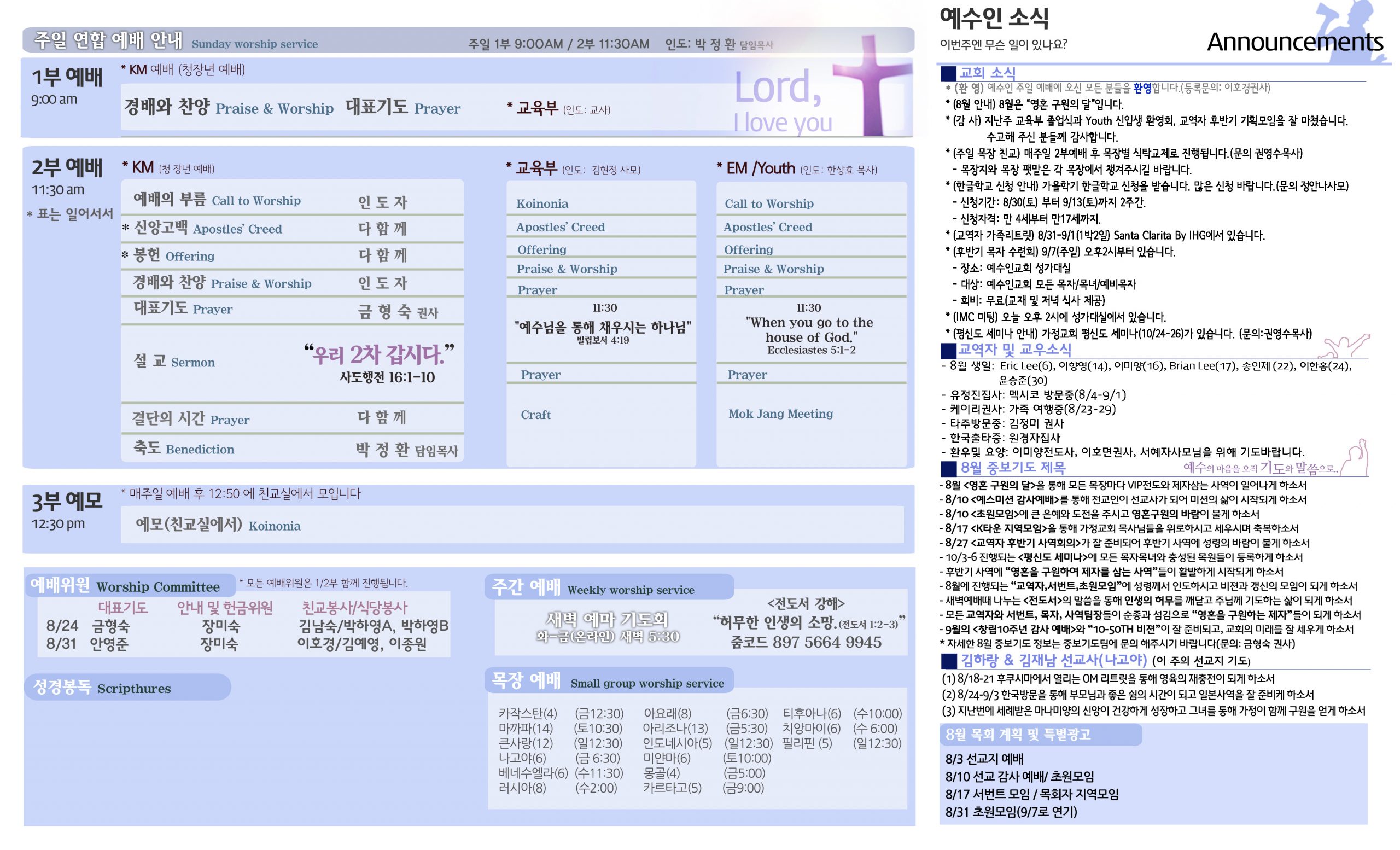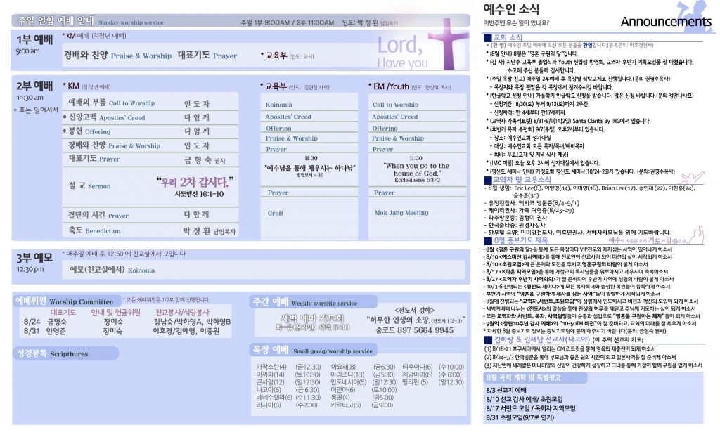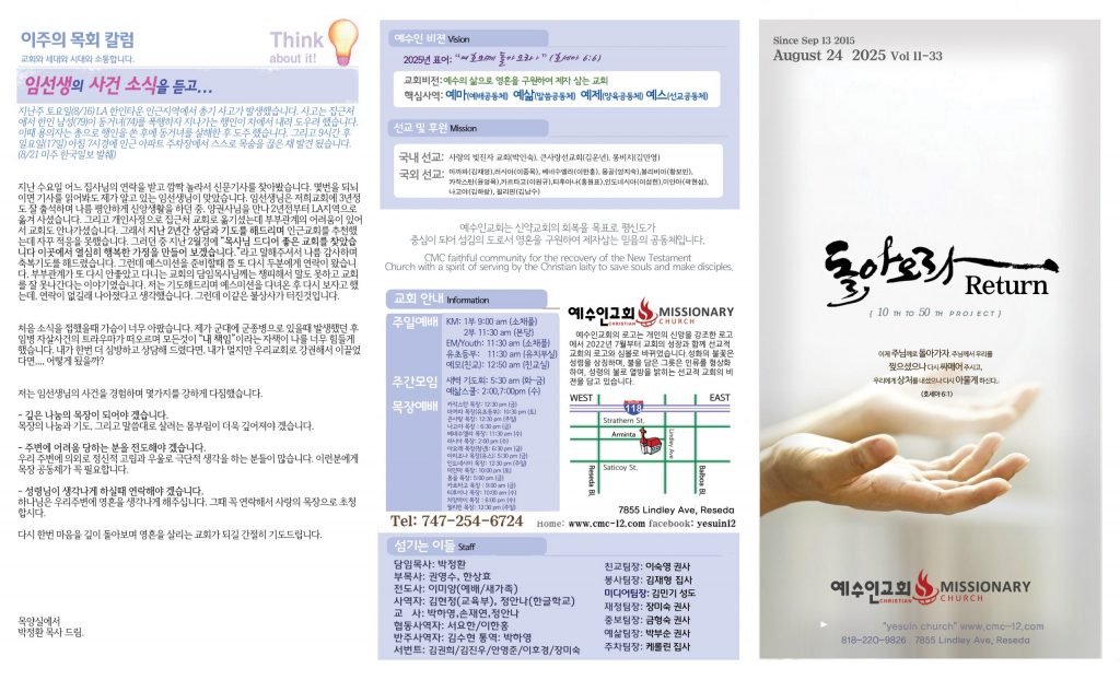 8/24 주보 By 예수인교회 Posted 08/24/2025 In 주보 0 0 예수인교회 Recent Posts10/12 주보Annointing 60 행 18:12-23 성장하게 만드는 탈진가을 특새 메세지 아가서 6: 1-10 일어나 함께가는 사랑10/5 주보 Leave a Comment 응답 취소 다음 번 댓글 작성을 위해 이 브라우저에 이름, 이메일, 그리고 웹사이트를 저장합니다.