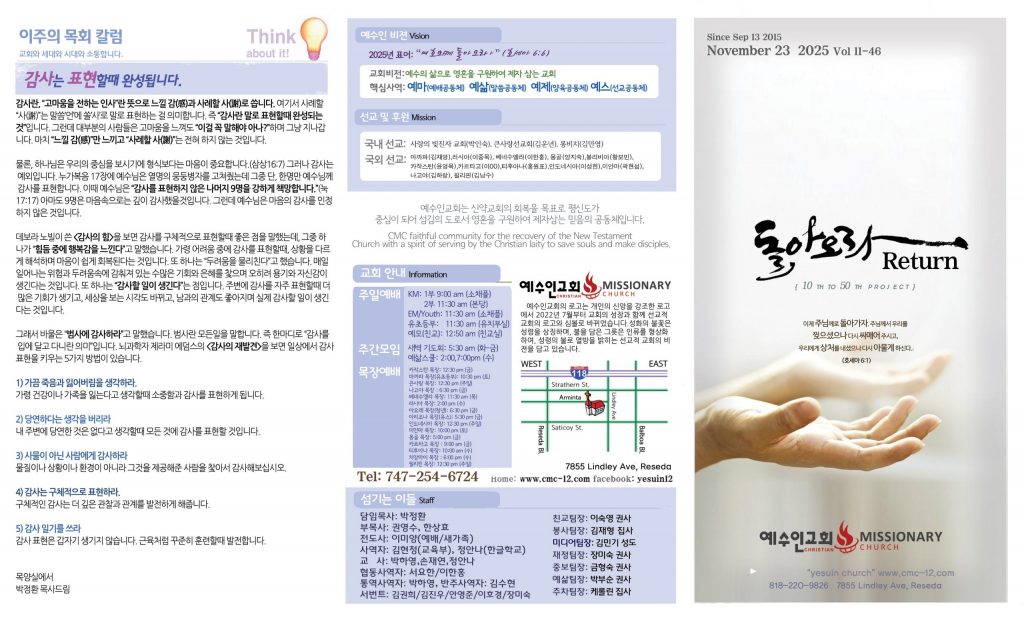 11/23 주보 By 예수인교회 Posted 11/23/2025 In 주보 0 0 예수인교회 Recent Posts11/23 감사절 VIP 초청예배11/23 주보감사시리즈 2 엡 5:4 감사의 말을 해야 하는 이유11/16 허그식 Leave a Comment 응답 취소 다음 번 댓글 작성을 위해 이 브라우저에 이름, 이메일, 그리고 웹사이트를 저장합니다.