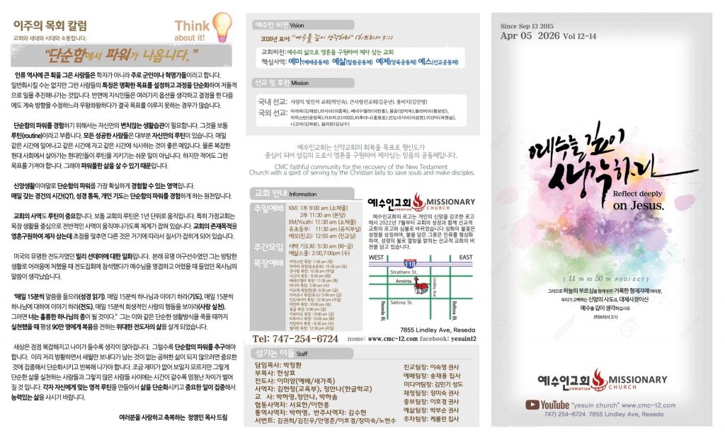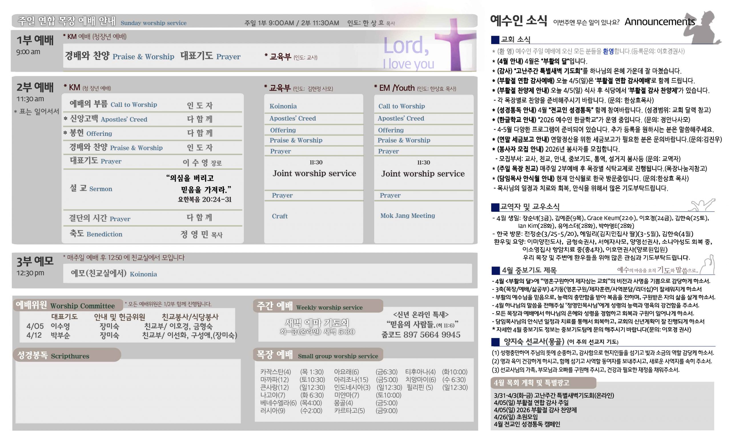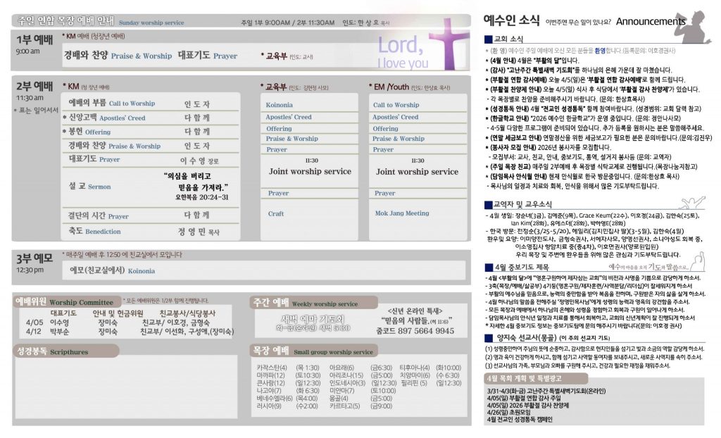 0405/주보 By 예수인교회 Posted 04/05/2026 In 주보 0 0 예수인교회 Recent Posts0405/주보Church of Jesus 13 요 3:16/ 딤전 1:13-16 “십자가의 두 음성”03/29 주보Church of Jesus 12 베드로전서 5:1-4 “이렇게 양 떼를 돌보라.” Leave a Comment 응답 취소 다음 번 댓글 작성을 위해 이 브라우저에 이름, 이메일, 그리고 웹사이트를 저장합니다.