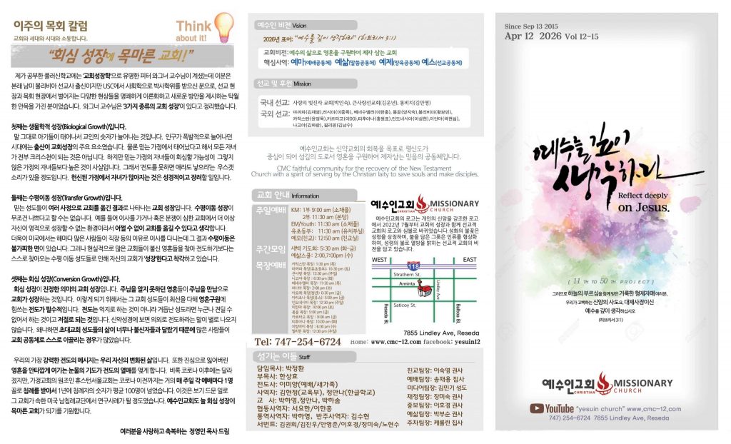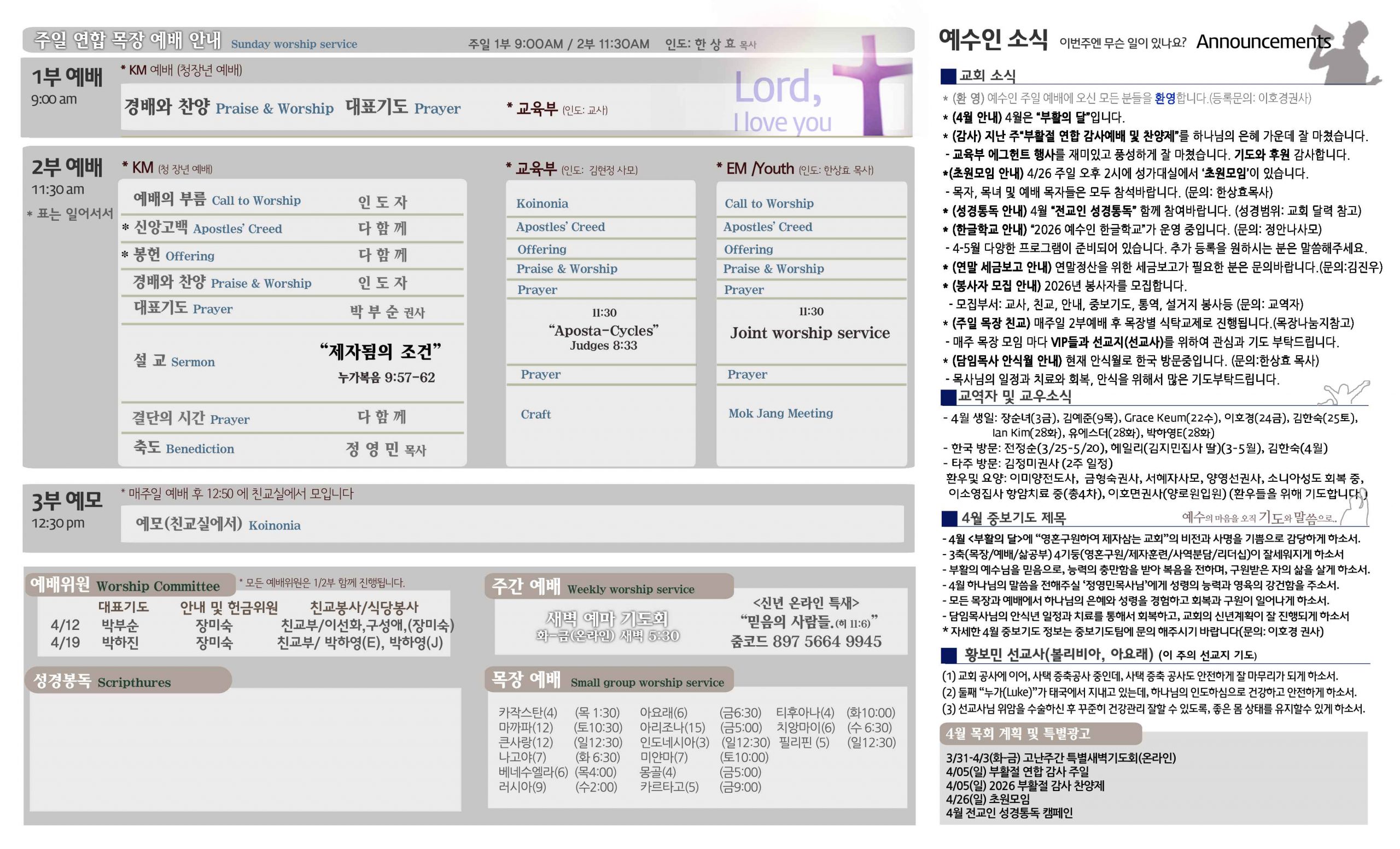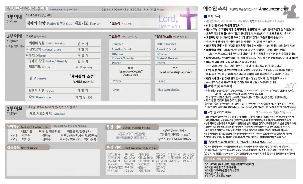 04/12 주보 By 예수인교회 Posted 04/12/2026 In 주보 0 0 예수인교회 Recent PostsChurch of Jesus 15 누가복음(Luke) 9:57-62 “제자됨의 조건” The Requirements for Discipleship.04/12 주보Church of Jesus 14 요한복음(John) 20:24-31 “의심을 버리고 믿음을 가져라.”0405/주보 Leave a Comment 응답 취소 다음 번 댓글 작성을 위해 이 브라우저에 이름, 이메일, 그리고 웹사이트를 저장합니다.